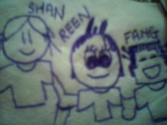 Chit chat with shan and reen which we have not been contacting with one another much or meet up much after my hospitalisation. Then reen and shan start playing with my phone and taking snap shots of themself. Damn funny...! hahaha... Then started to draw cartoon on the napkin... Shan started this... and I draw my version too. Mine look so weird and funny... hahaha... Now I just set the picture shan draw as my wallpaper. heehee.. Shan taught me how to use my phone camera... haha.. so paiseh! That day I was using my this new phone E600C, i thought i was still using Nokia, i saved all the sms i wanted to the phone and delete it. Thought like save it to archieve. But I was wrong!! It just shift the sms to the phone memory not saving it to a folder! and all msgs that I want are all GONE! Deleted by my own hands!! All the msgs you guys sent to me when I was hospitalised. Really Thank You for coming down to see me. Make you guys rush down and worried for me. Thanks!! *Hugs*